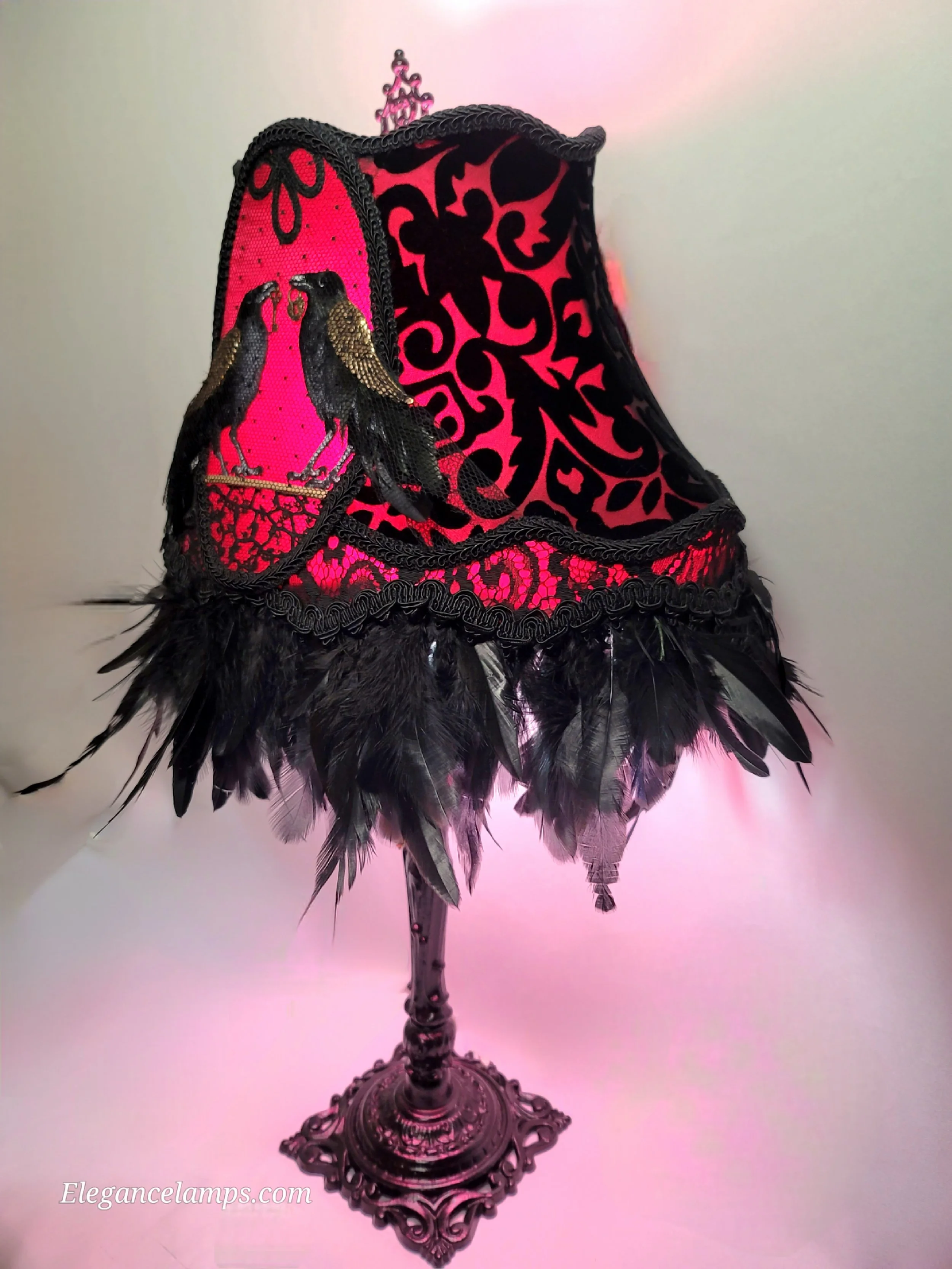 The lampshade is a dramatic confection of hand-sewn crimson silk and black silk velvet devore, adorned with antique silk lace and vintage trims. It features natural feathers and an exquisitely hand-embellished embroidered raven.